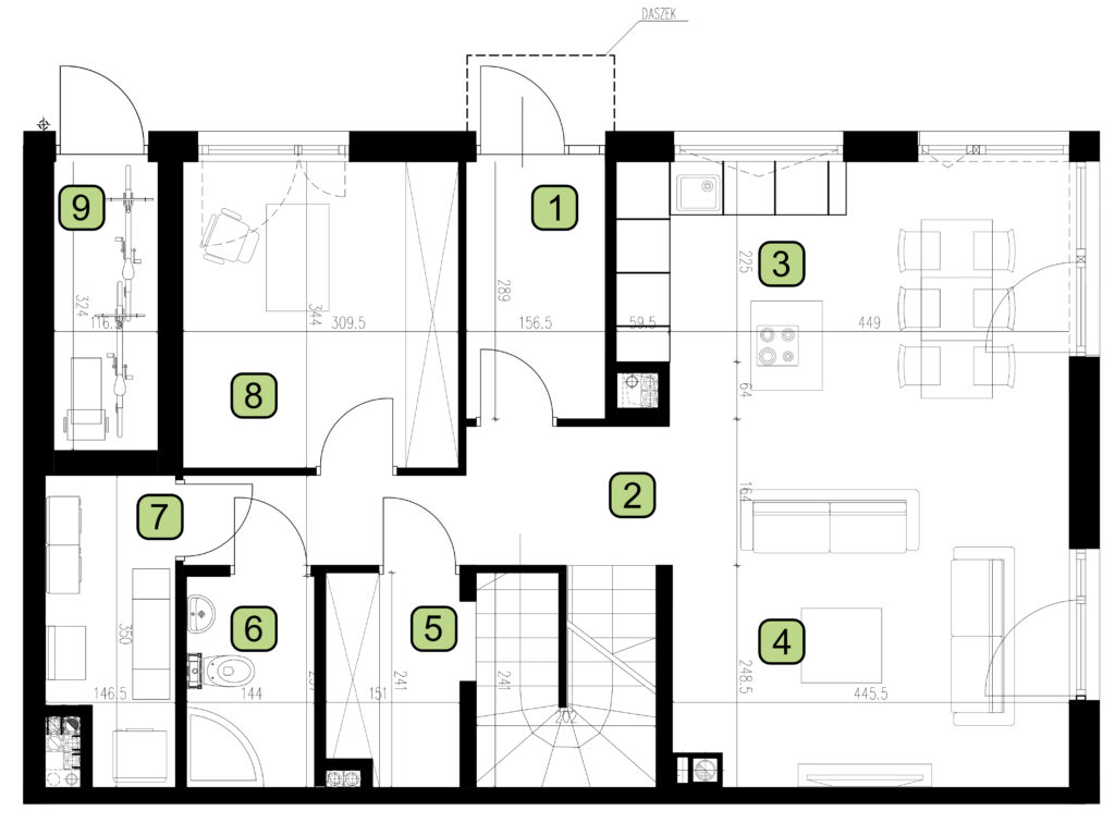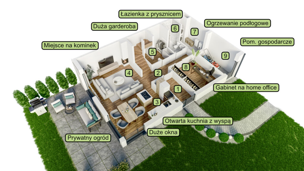 salon z aneksem kuchennym, łazienka, gabinet, pom. gospodarcze, wiatrołap i kotłownia.