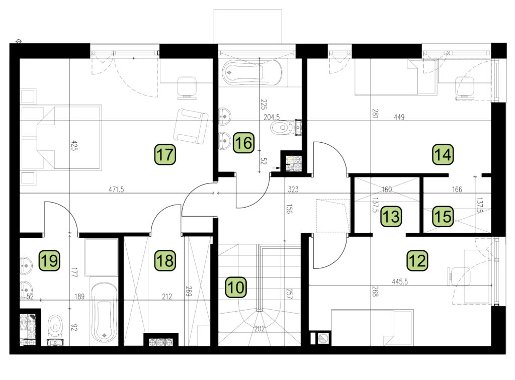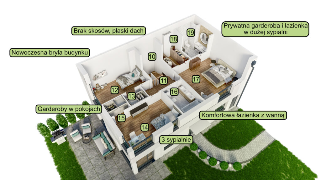 3 sypialnie, 2 łazienki, możliwość łatwego podziału jednego pokoju na dwa.