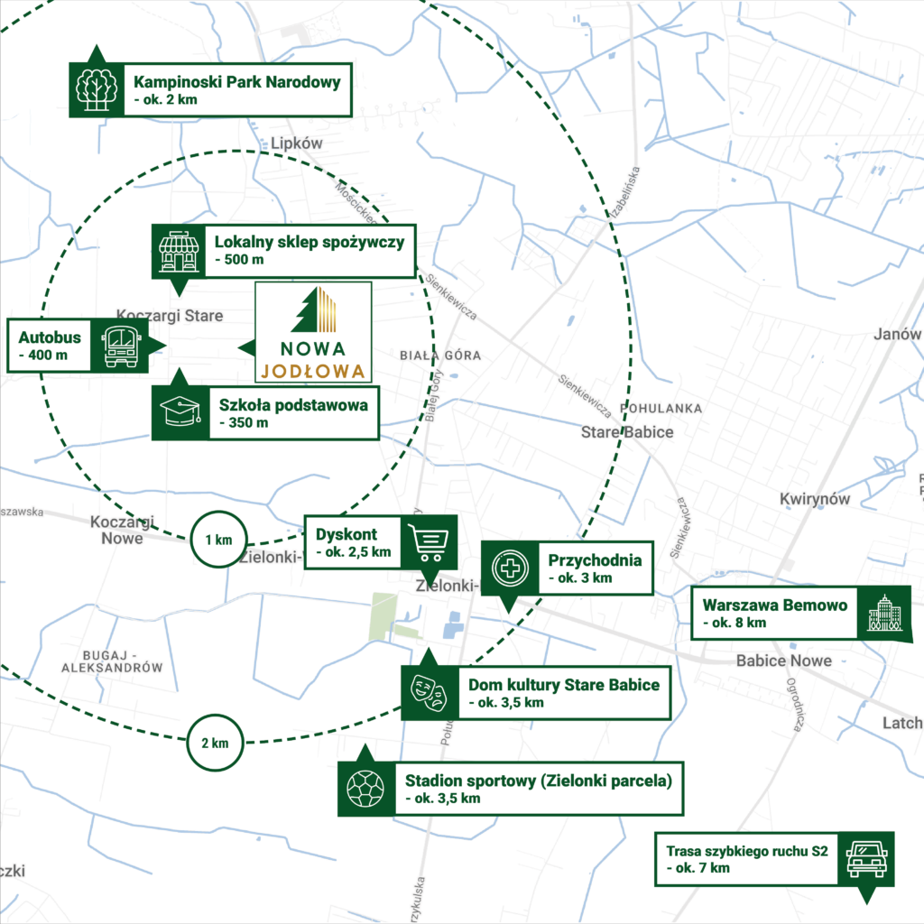 Okolica obfituje w tereny rekreacyjne, w tym pobliski Kampinoski Park Narodowy – zaledwie 2 km od inwestycji. To doskonała przestrzeń do wypoczynku i aktywności na świeżym powietrzu. W bliskim sąsiedztwie znajdują się także sklepy, szkoła oraz inne niezbędne usługi, co pozwala na wygodne i funkcjonalne życie.
